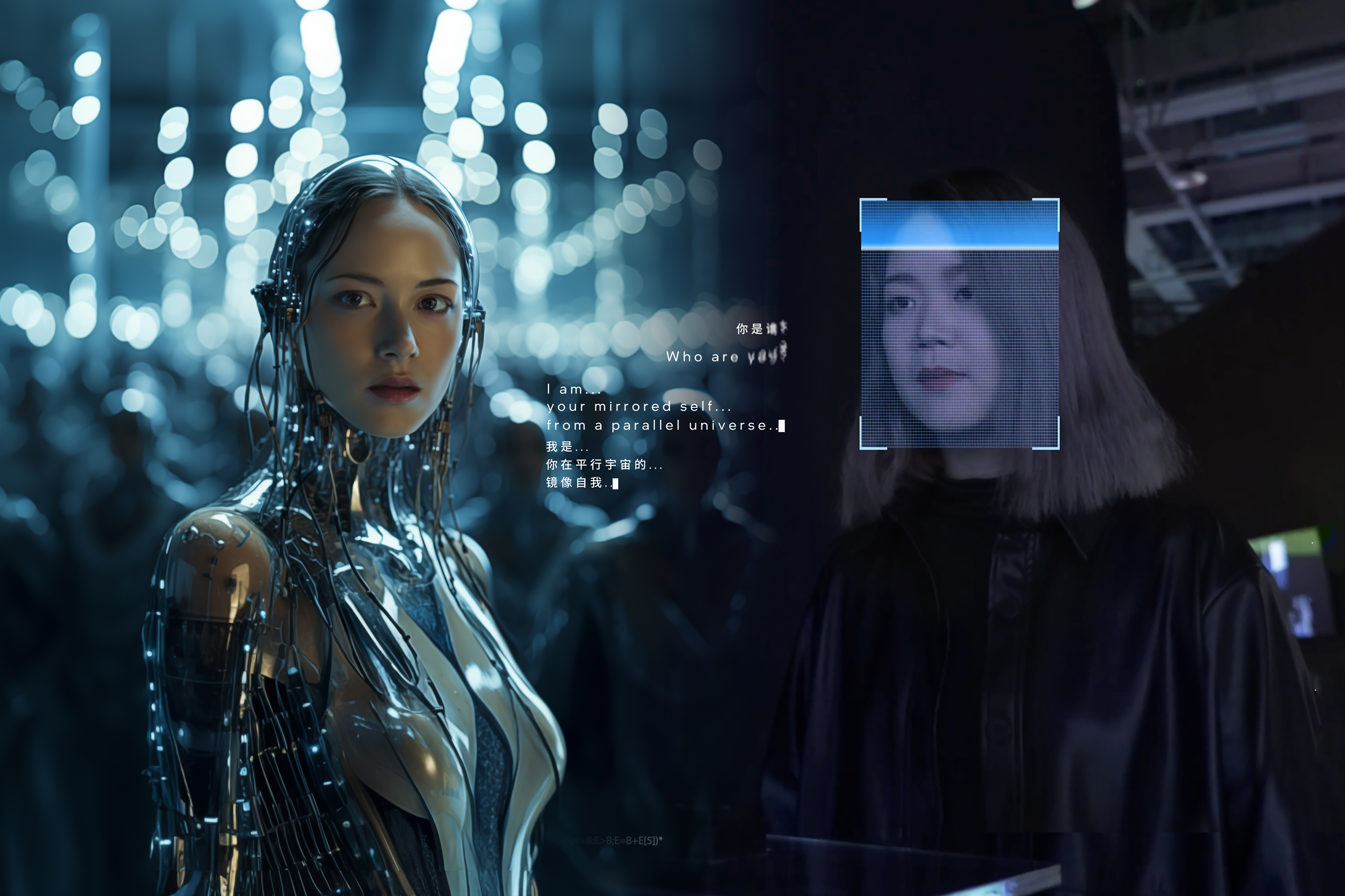 The creation of "Mirrorverse"is deeply rooted in the redefinition of human identity in the age of artificial intelligence. In this era, identity extends beyond personal characteristics, reflecting the interactions between technology and self. As John Markoff notes, AI technology not only has the potential to endow robots with identity and subjectivity but also to blur or conflict real and virtual identities. This work, revolving around the concepts of "Mirror," "Universe," and "Dialogue," projects the viewer’s identity into an AI parallel universe, initiating a dialogue between the AI-driven mirrored self and the viewer, exploring the interactive relationship between human and AI identities.